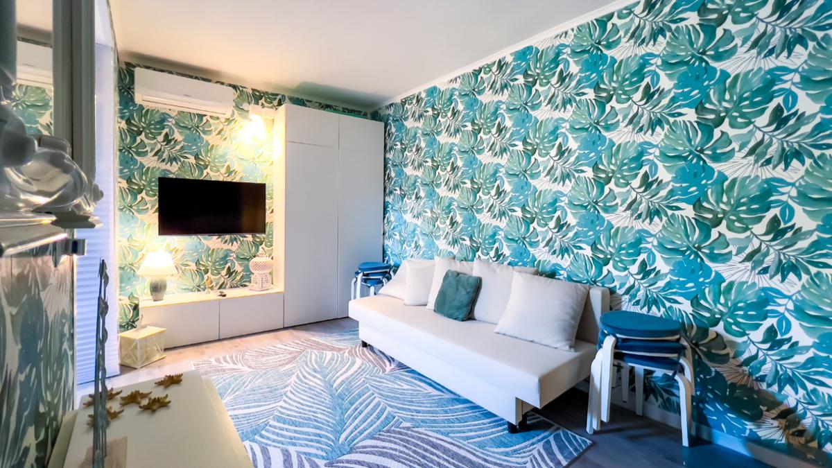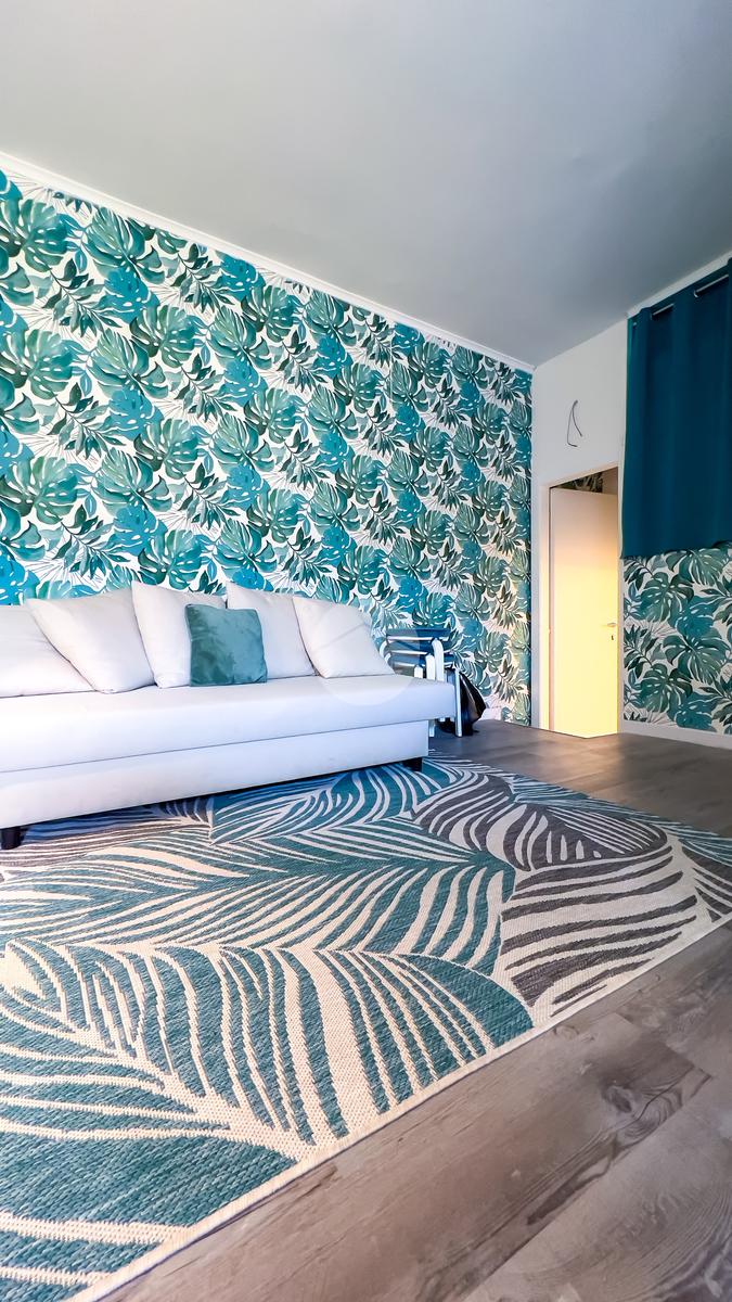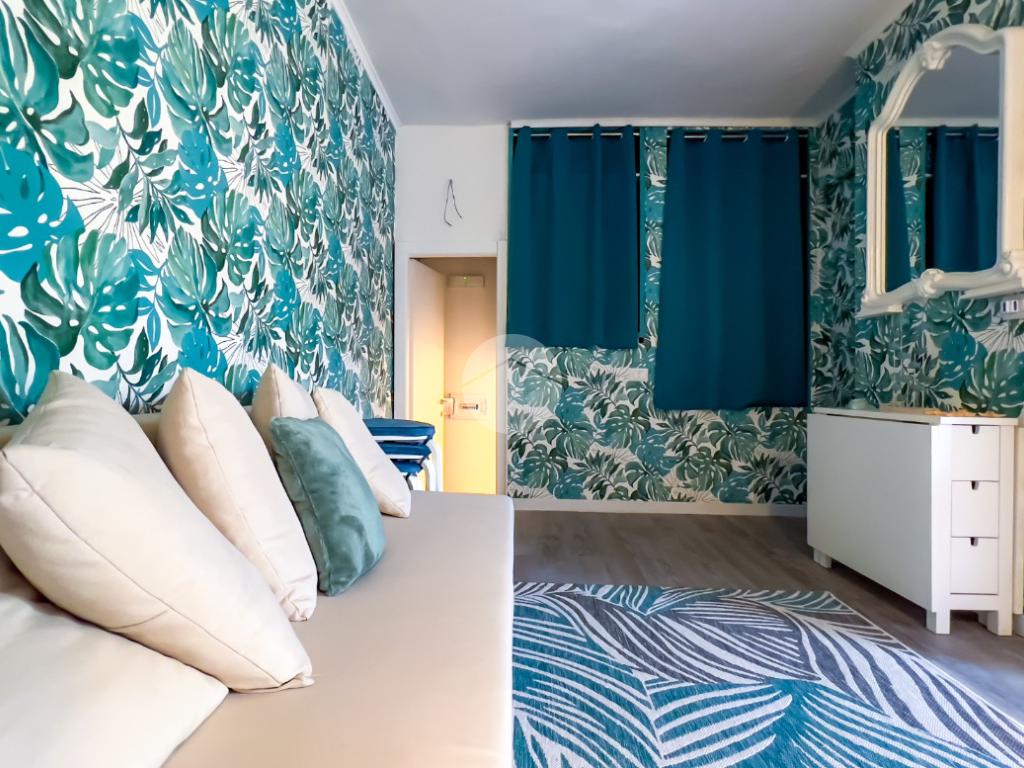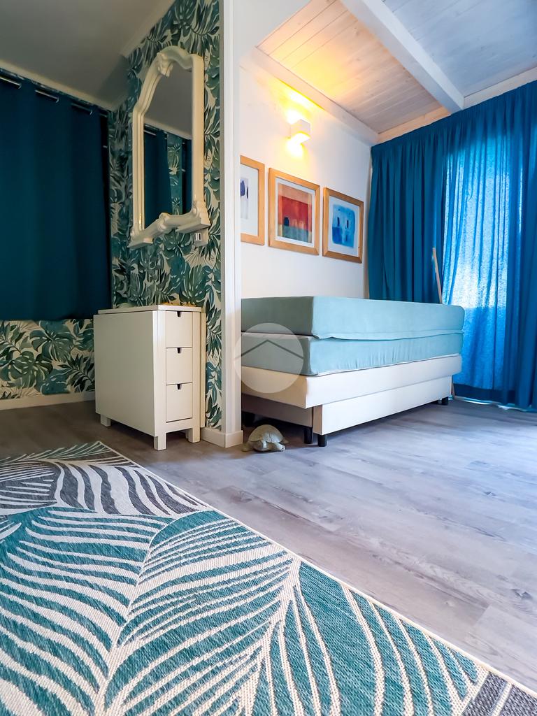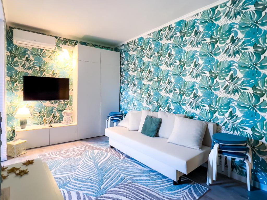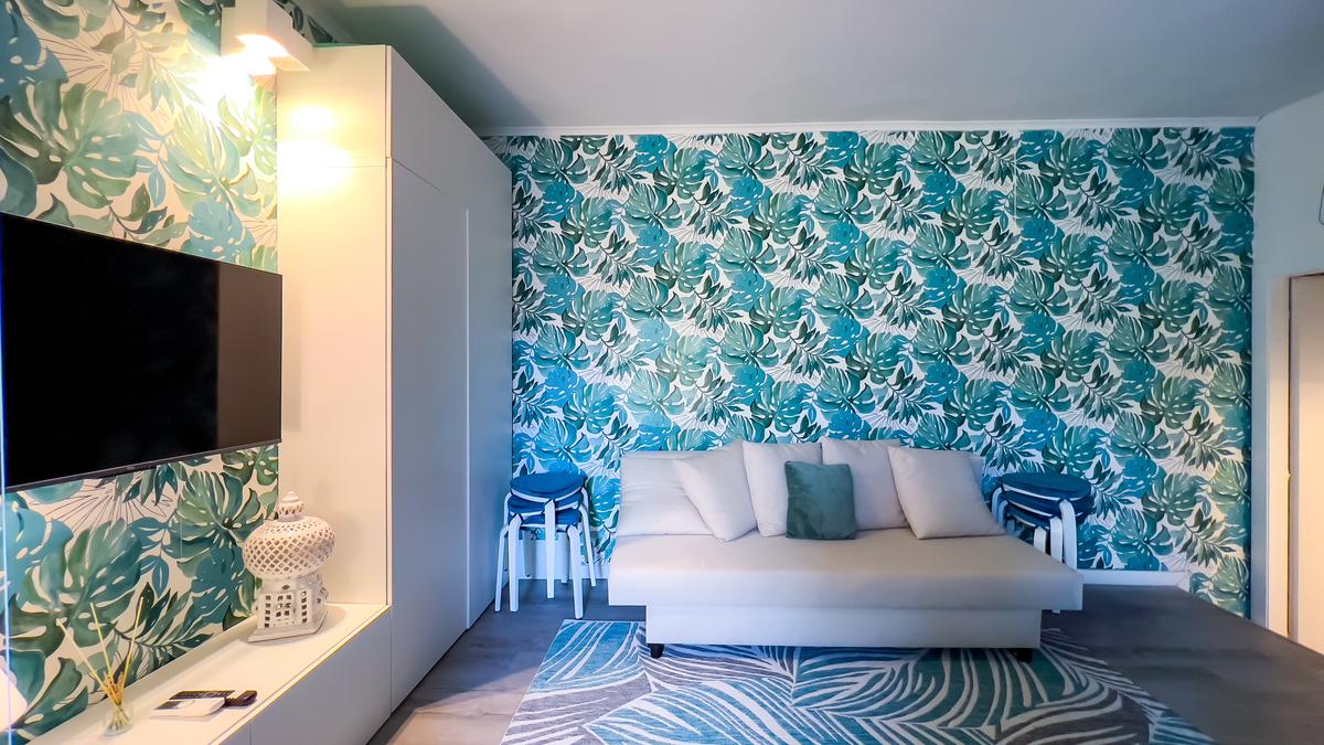 Il soggiorno, completamente ristrutturato, è luminoso e accogliente. Le fogliature blu sulle pareti, in armonia con i toni azzurri, richiamano il mare e creano un’atmosfera fresca e rilassante. Il divano letto e il nuovissimo angolo cottura rendono lo spazio funzionale, con la possibilità di aggiungere un secondo divano letto.