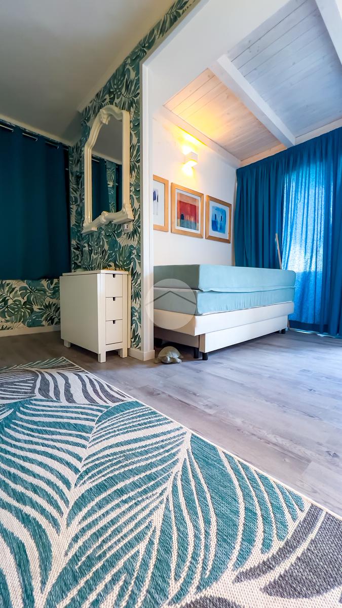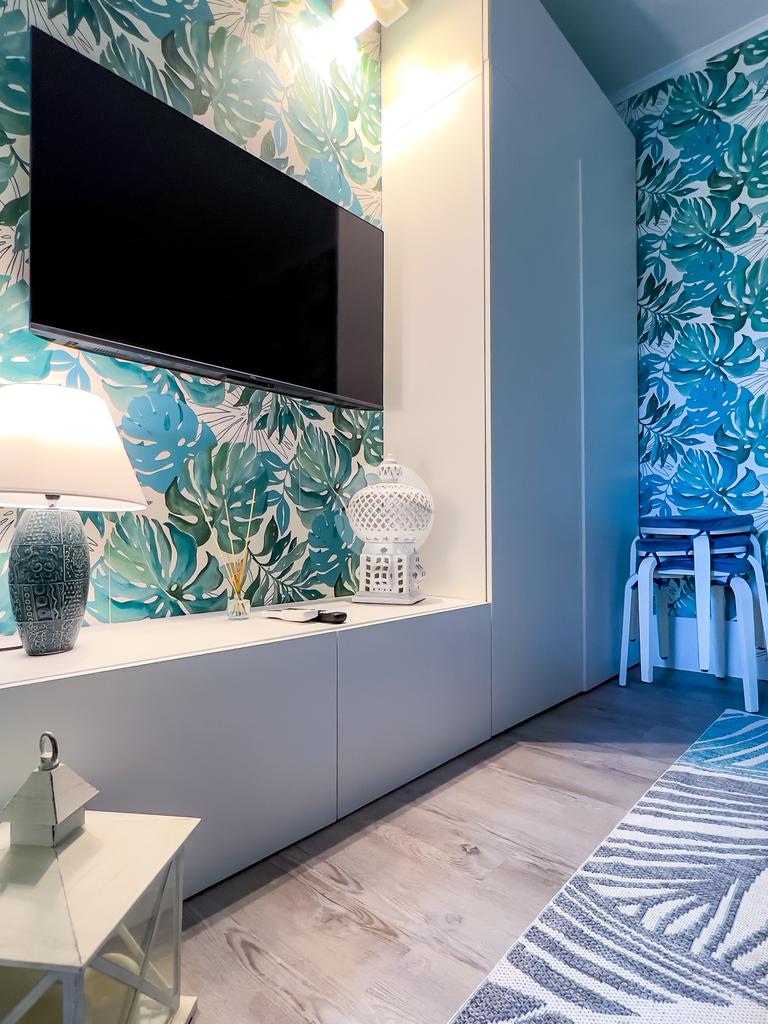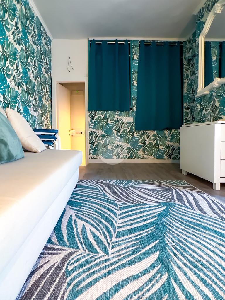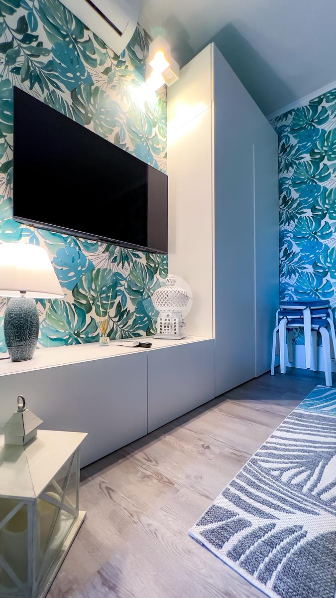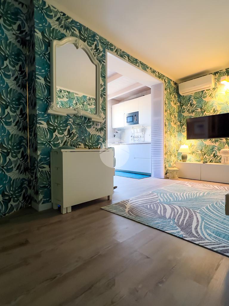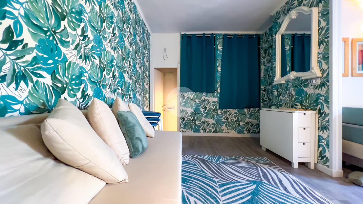 Il soggiorno, completamente ristrutturato, è luminoso e accogliente. Le fogliature blu sulle pareti, in armonia con i toni azzurri, richiamano il mare e creano un’atmosfera fresca e rilassante. Il divano letto e il nuovissimo angolo cottura rendono lo spazio funzionale, con la possibilità di aggiungere un secondo divano letto.