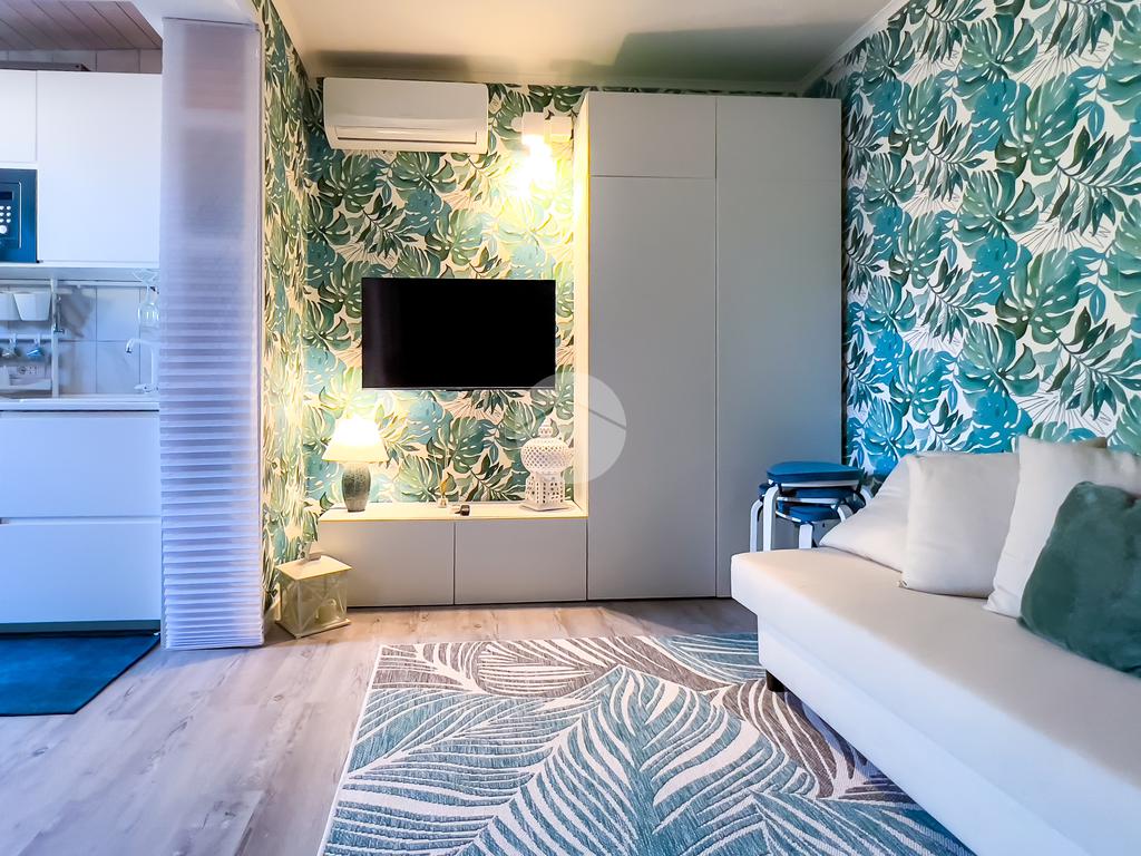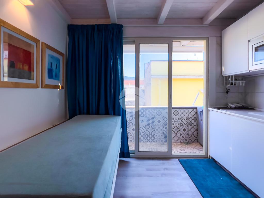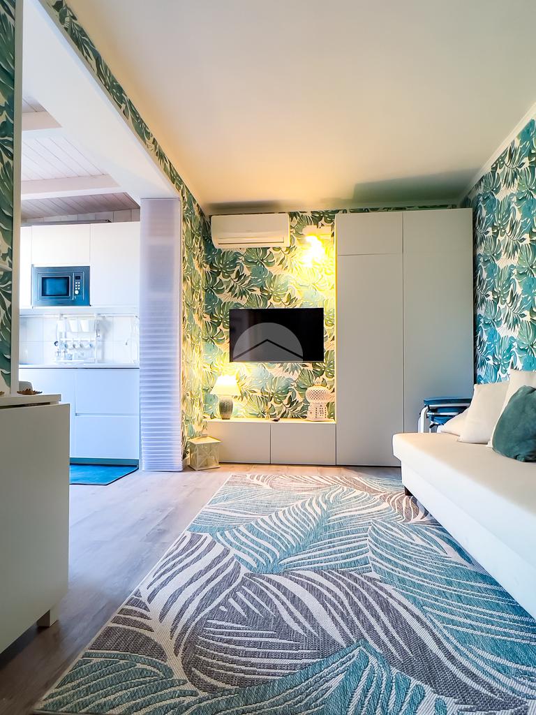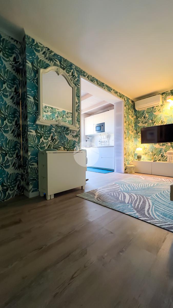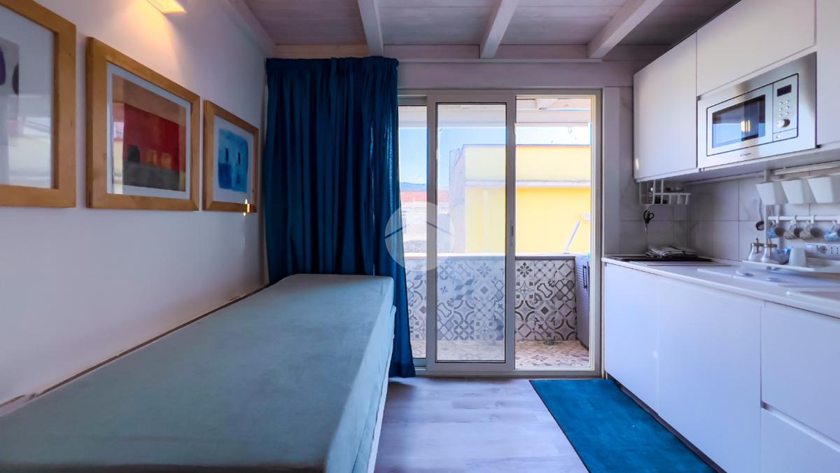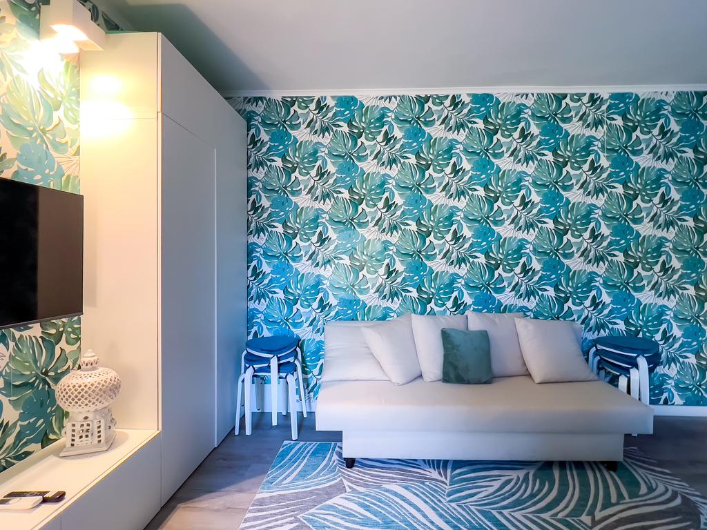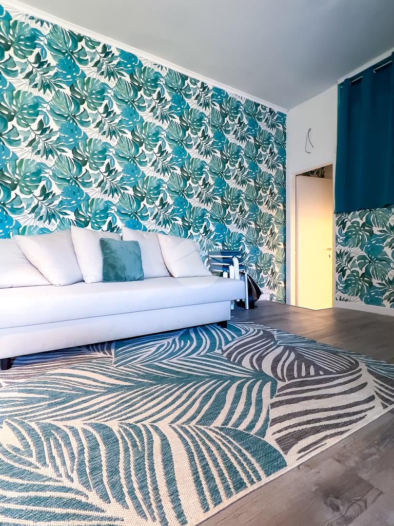 Il soggiorno, completamente ristrutturato, è luminoso e accogliente. Le fogliature blu sulle pareti, in armonia con i toni azzurri, richiamano il mare e creano un’atmosfera fresca e rilassante. Il divano letto e il nuovissimo angolo cottura rendono lo spazio funzionale, con la possibilità di aggiungere un secondo divano letto.