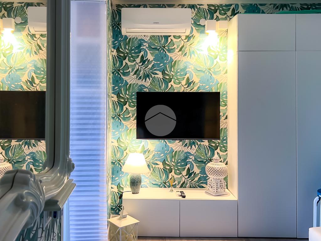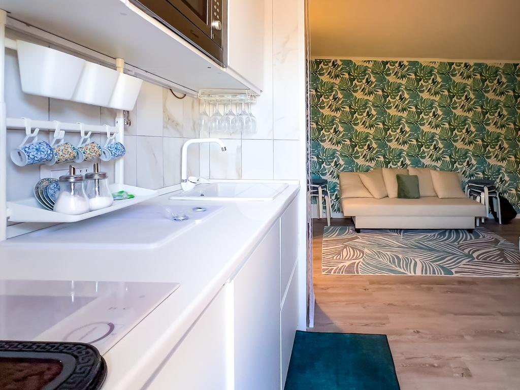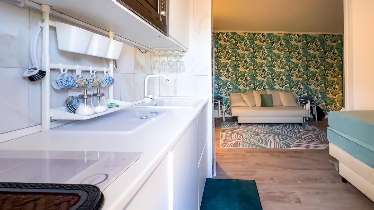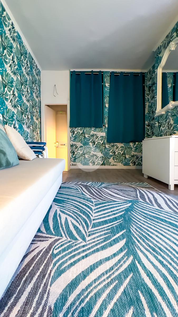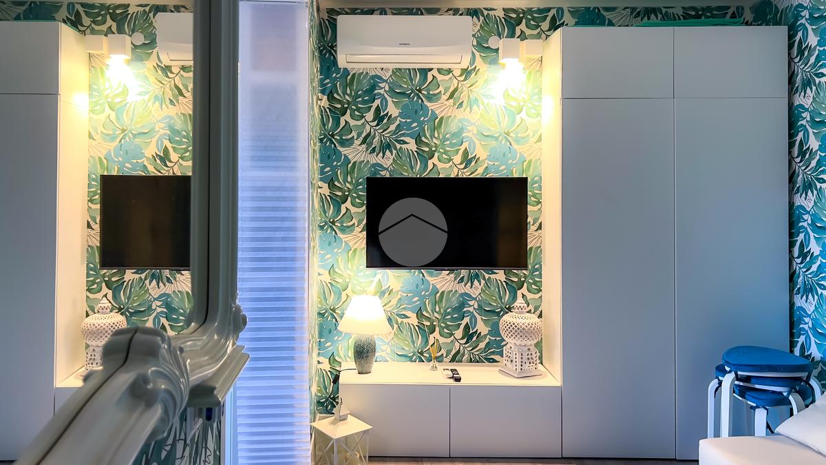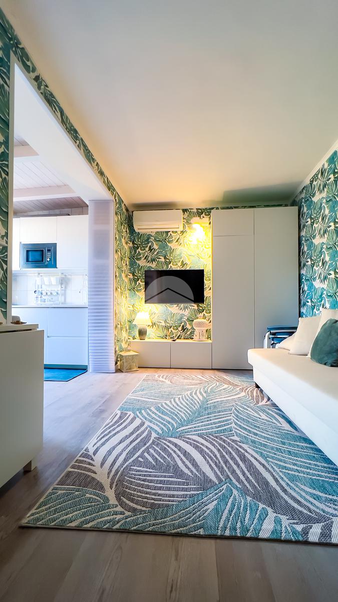 Il soggiorno, completamente ristrutturato, è luminoso e accogliente. Le fogliature blu sulle pareti, in armonia con i toni azzurri, richiamano il mare e creano un’atmosfera fresca e rilassante. Il divano letto e il nuovissimo angolo cottura rendono lo spazio funzionale, con la possibilità di aggiungere un secondo divano letto.