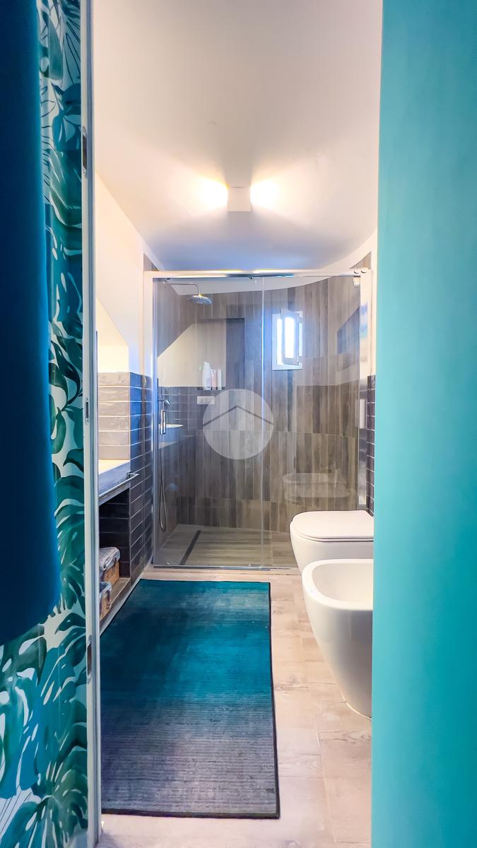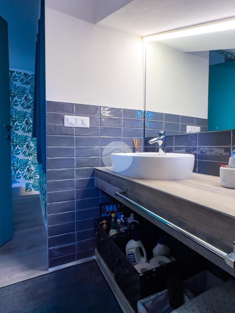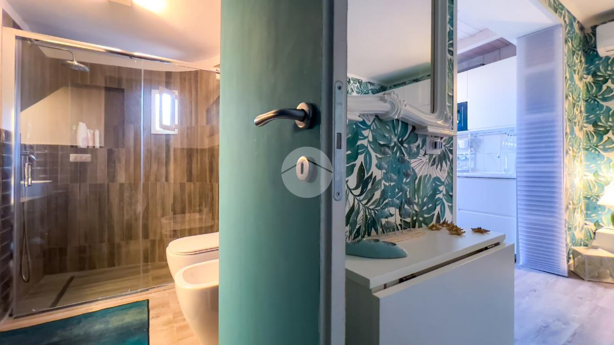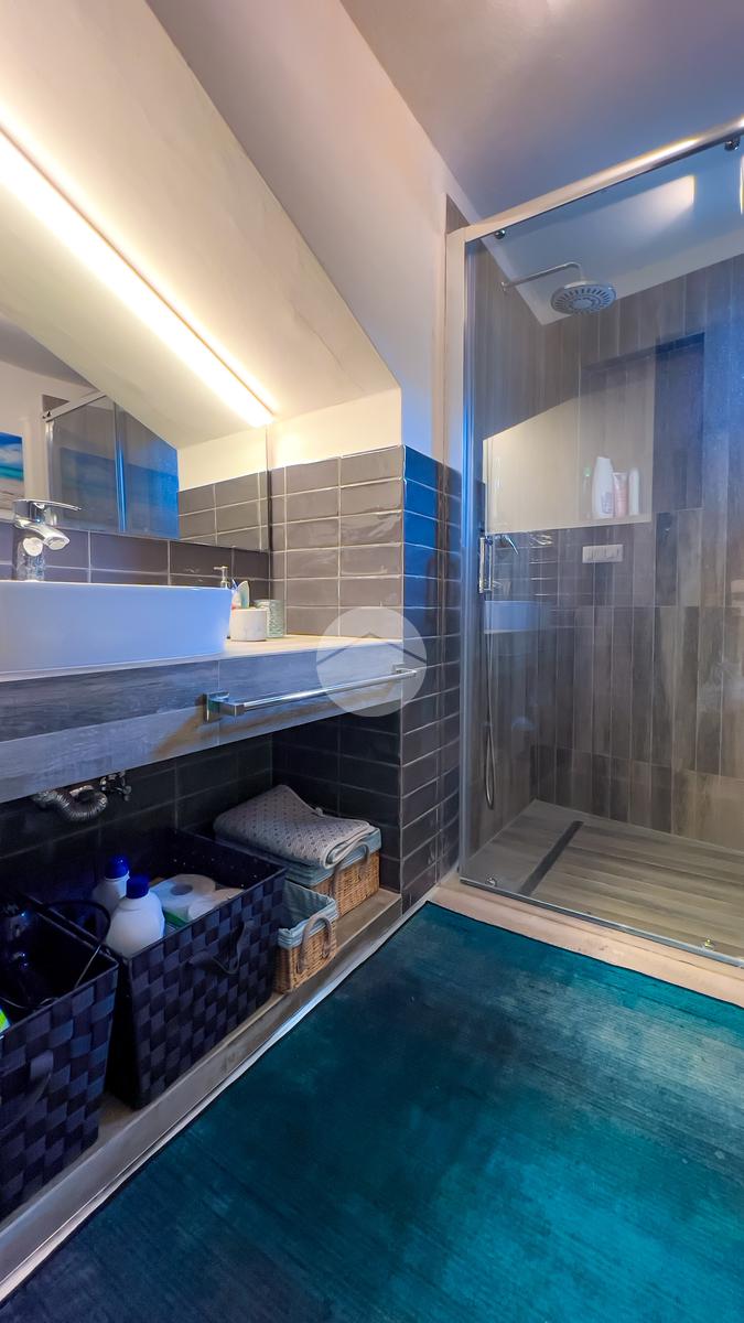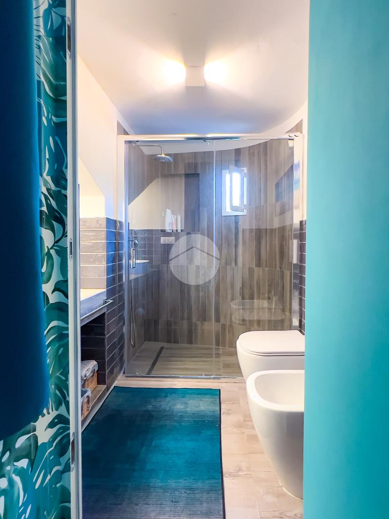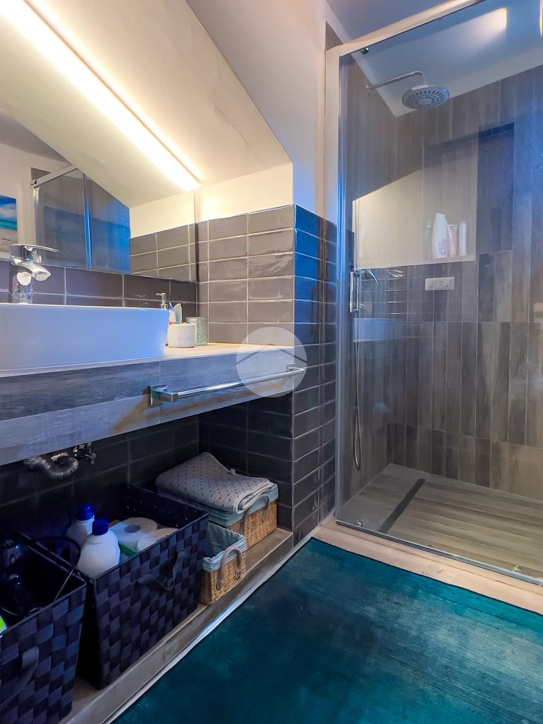 Il bagno, anch’esso ristrutturato, è ampio e dotato di box doccia. Dal soggiorno si accede al balcone, da cui una scala conduce al livello superiore.