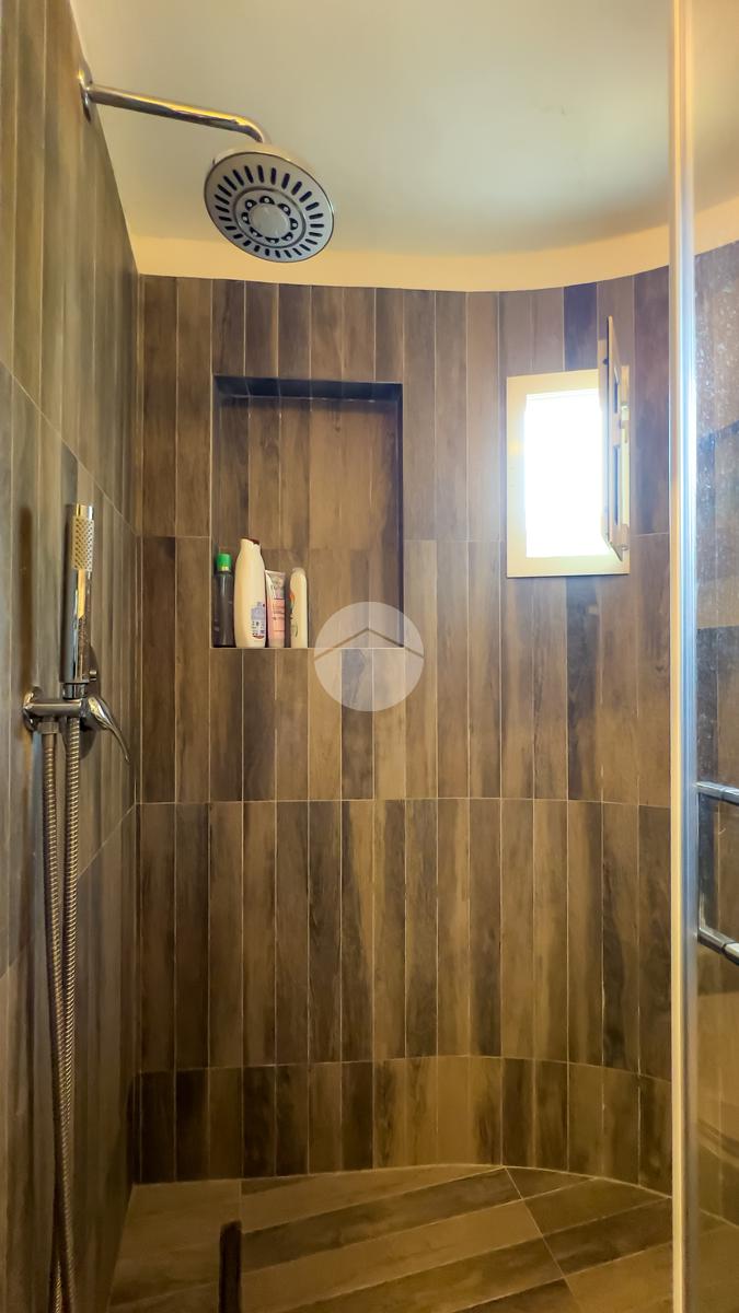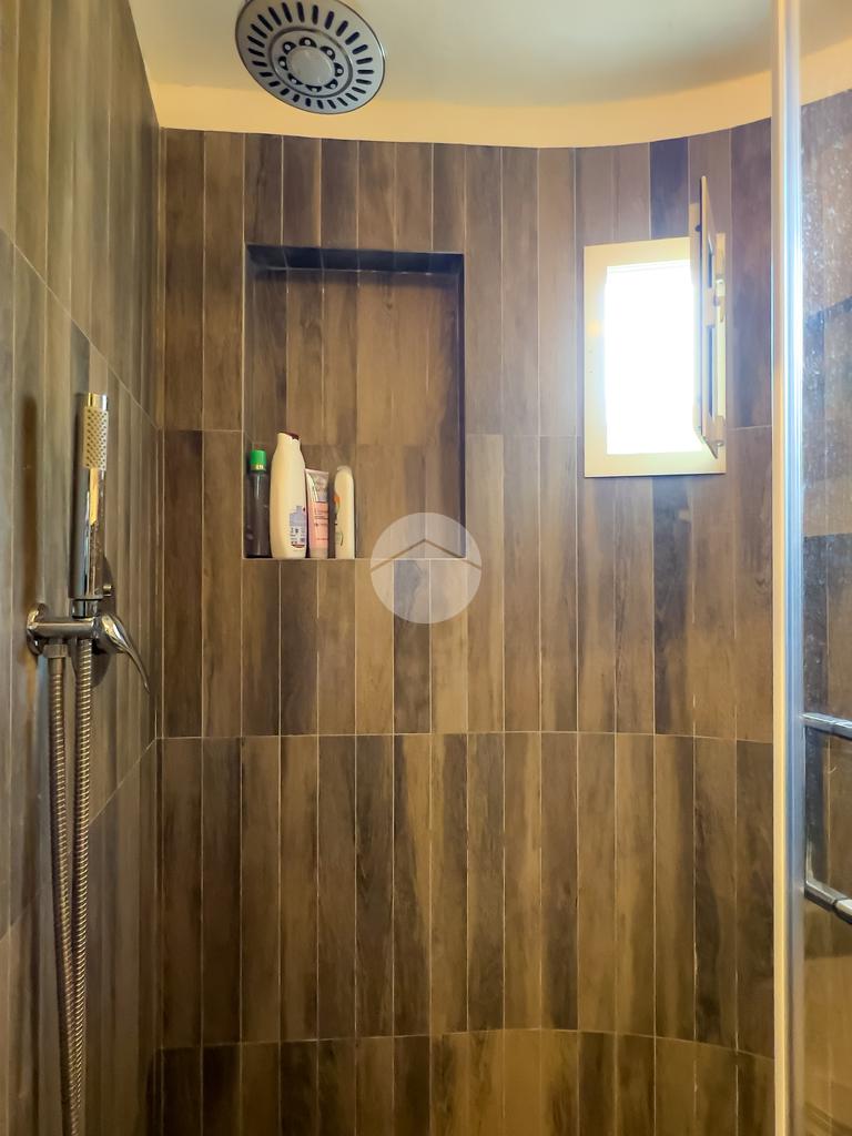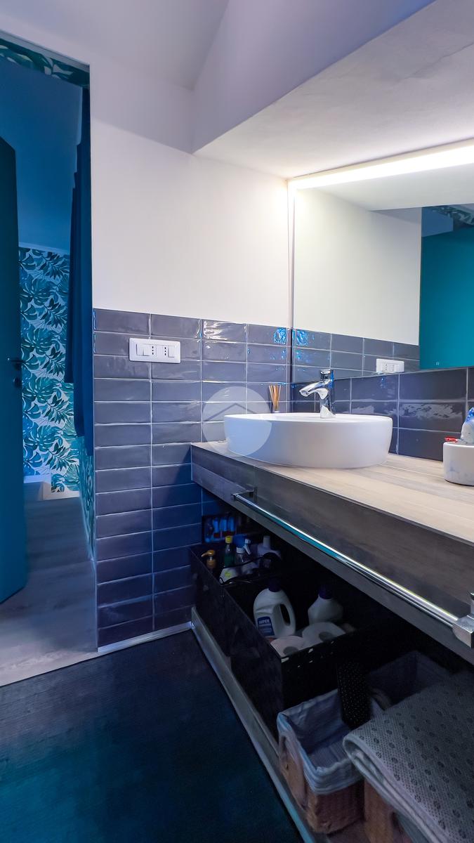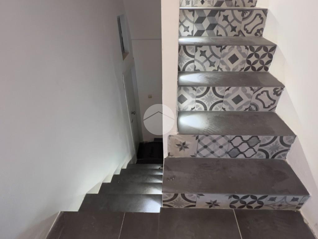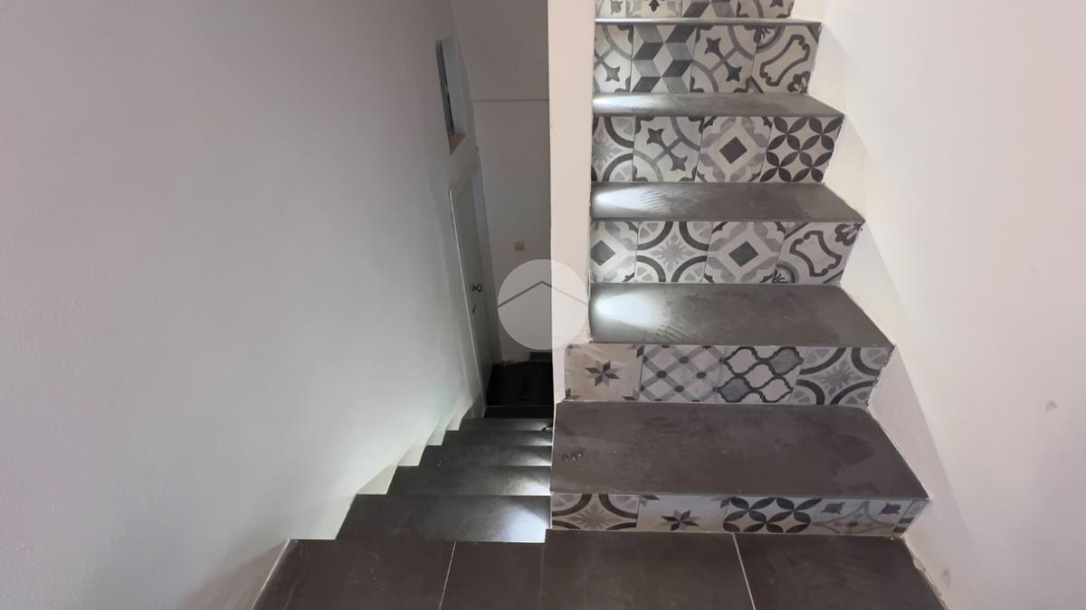 Il bagno, anch’esso ristrutturato, è ampio e dotato di box doccia. Dal soggiorno si accede al balcone, da cui una scala conduce al livello superiore.